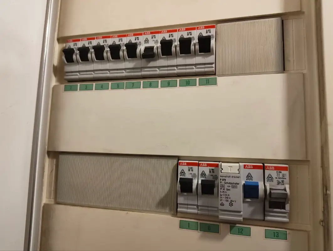 Schritt 1: FI-Schalter von Leitungsschutzschaltern unterscheiden Öffnen Sie den Sicherungskasten. Der FI-Schalter ist breiter als ein Leitungsschutzschalter und hat einen deutlich sichtbaren Prüfknopf, der mit „Test" oder „T" beschriftet ist. Er ist oft mit dem Fehlerstromsymbol (Erdungssymbol mit Wellenlinien) oder „FI" gekennzeichnet. Er sitzt oft am Anfang des Sicherungsfelds und schaltet mehrere Leitungsschutzschalter dahinter ab. Wenn der FI auslöst, sind alle Stromkreise hinter ihm ohne Strom, obwohl die einzelnen Leitungsschutzschalter noch in Einstellung sind.